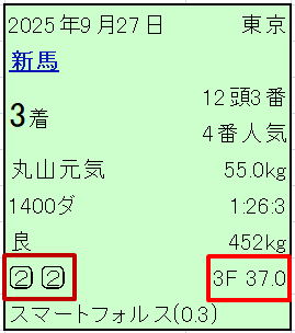 今回のレースまでの間に1200m~1400mのダートコース(東京ダート1300mだとなおいい)での上り3Fが最も早いレースがある
