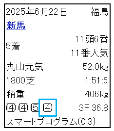 ※参考までにJRAのホームページの表示を例にすると水色で囲った部分が最後のコーナーの通過順位を表しています