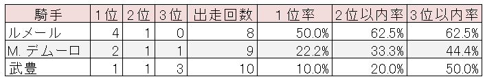 ルメールは3位以内(複勝圏内)が62.5%、1位が50%という成績から的中を目指すなら外せない