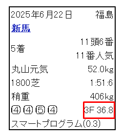※参考までにJRAのホームページの表示を例にすると赤で囲った部分が上り3Fを表しています