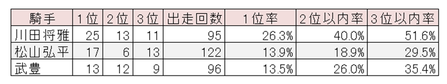 川田と比較すると大きく劣るが松山と武豊は3位以内がおよそ3回に1回と好成績を残している