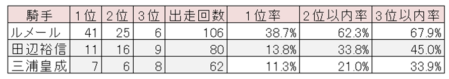 ルメールの成績は1位が3回に1回、3位以内が3回に2回でとんでもない成績