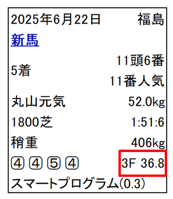 ※参考までにJRAのホームページの表示を例にすると赤色で囲った部分が上り3Fを表しています