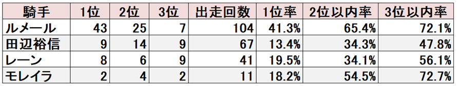 ルメールと田辺が特にこのコースと相性がよく、過去3年間の彼自身の成績を大きく上回っている