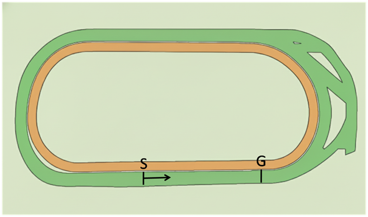 図の下側中央のSからスタートし、Gを通り過ぎてもう一度Gまで走ったところがゴール