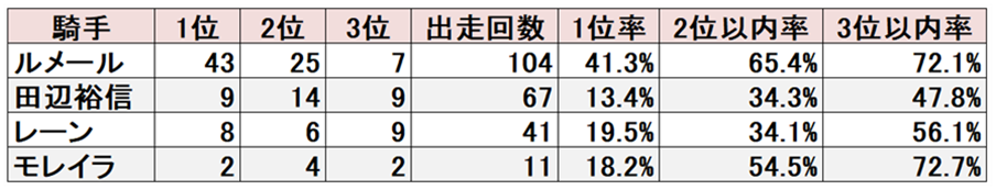 ルメールと田辺が特にこのコースと相性がよく、過去3年間の彼自身の成績を大きく上回っている