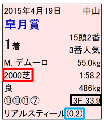 ※参考までにJRAのホームページの表示を例にすると赤色で囲った部分が距離と芝またはダートといったコース情報、黒色で囲った部分が上り3F、水色で囲った部分はそのレースの1着馬の場合は2着馬とのタイム差または1着馬以外の場合は1着馬からのタイム差がわかる